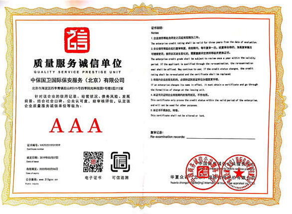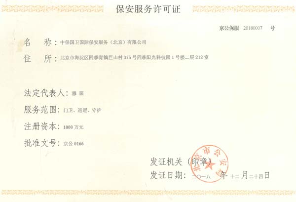 中保國衛(wèi)國際保安服務(北京)有限公司,屬中保國衛(wèi)集團旗下子公司。能全方位的為大型客戶提供優(yōu)質(zhì)的安保、押運服務,是集人防和技防于一體的新型正規(guī)化綜合安保押運服務企業(yè),提供人防、物防、技防、聯(lián)網(wǎng)報*、非武裝押運等安防相關的一站式服務。